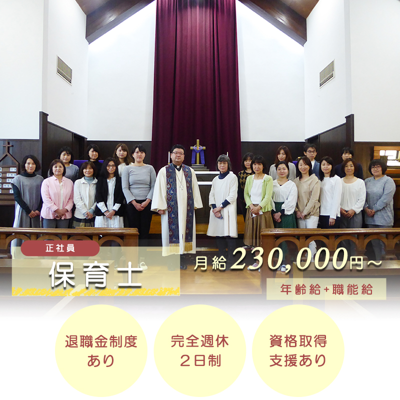 | 募集職種 | 認可保育所の保育士 / 研修制度充実 / 残業ほぼなし / 綺麗な園舎と園庭が魅力 |